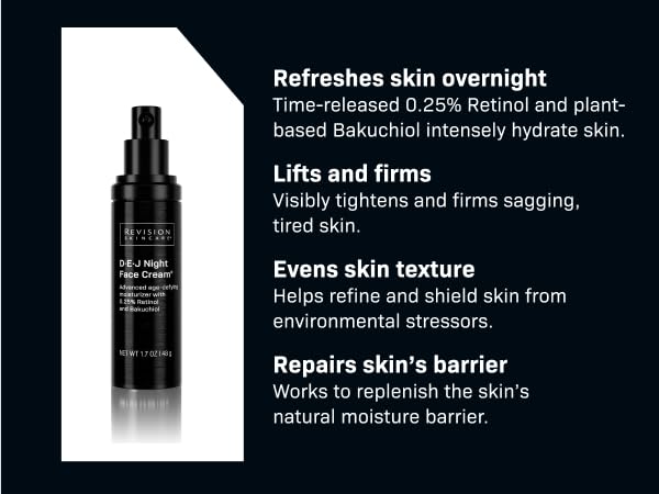 D·E·J Night Face Cream® is an intensive nighttime moisturizer that features a unique combination of time-released 0.25% Retinol and plant-based Bakuchiol in a hydrating, antioxidant-rich formula that minimizes irritation and can be used on all skin types to rejuvenate and reveal new, younger-looking skin overnight.